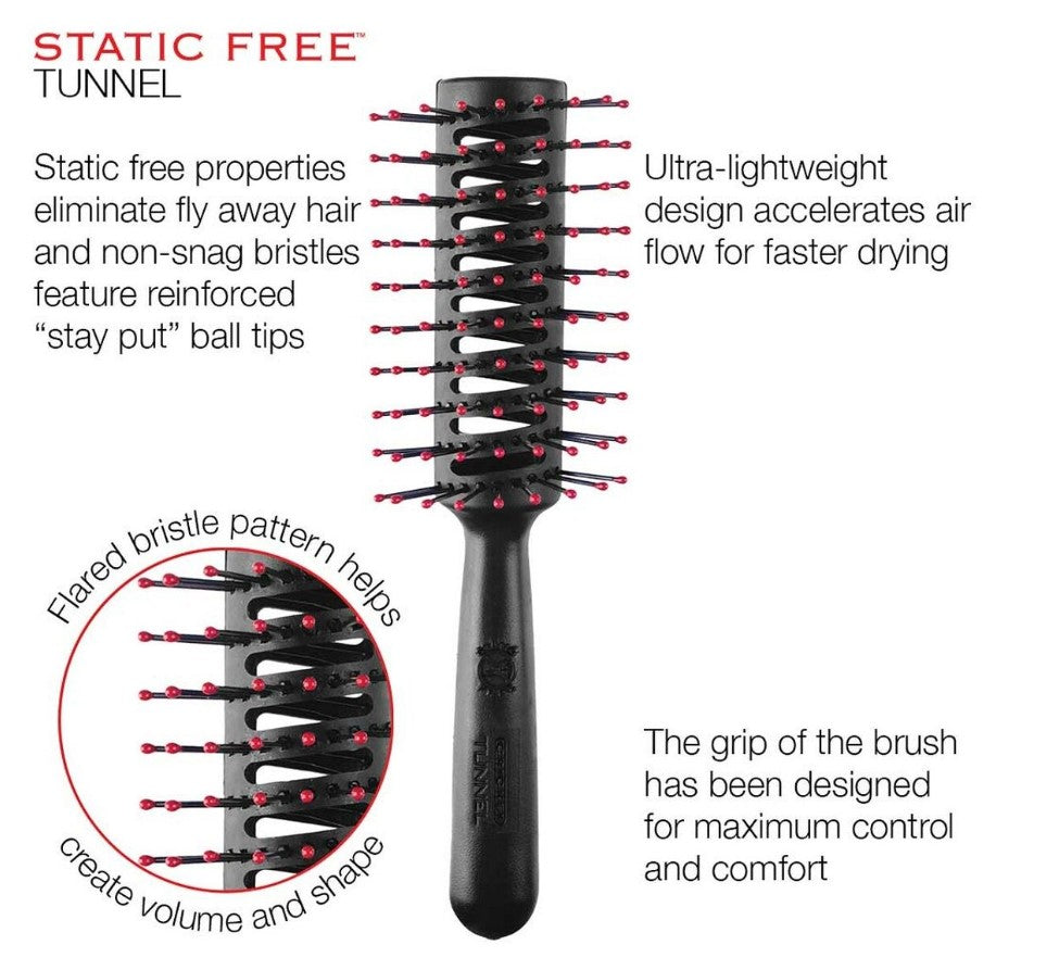Ultra lightweight design accelerates air flow for faster drying, while the flared bristle pattern shapes and styles.
