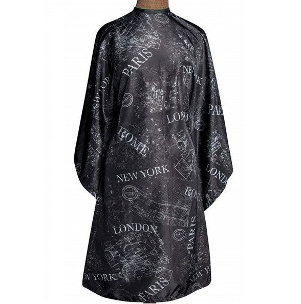 - 1907 City Maps Hairstyling Cape, Lightweight, polyester, water resistant, protective, adjustable, snap closure, barber, hair stylist, salon, haircut, stylist